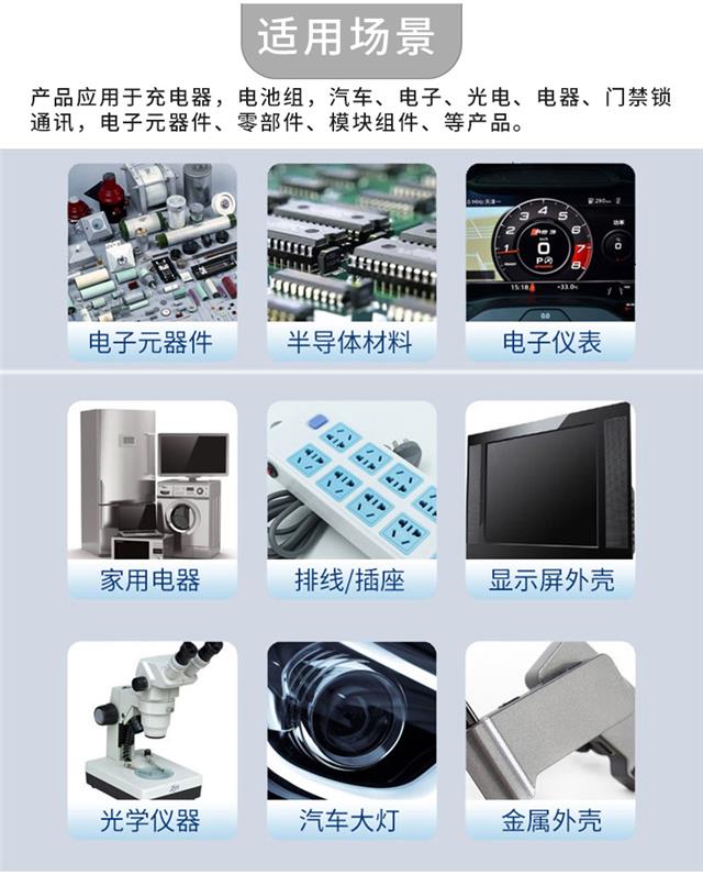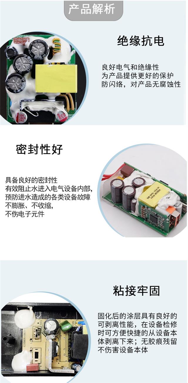 广泛用于电子元器件、照明组件、仪表仪器、电机、家电等产品的粘接,密封,防潮,减震,绝缘。